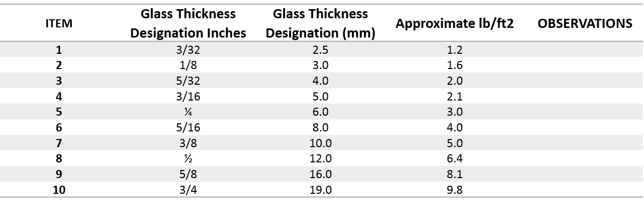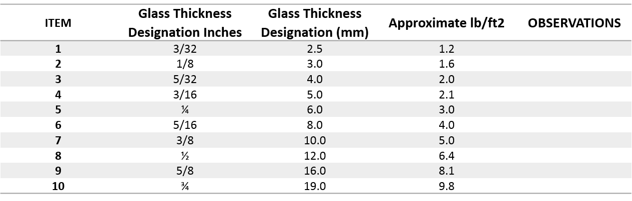 Insulating glass units are manufactured with glass in range of thickness from 3 to 10 mm (1/8" to 3/8") or more in special applications. Laminated or Tempered glass may also be used as part of the construction. most units are produced with the same thickness of glass used on both panes but special applications such as acoustic attenuation or security may require wide ranges of thicknesses to be incorporated in the same unit.